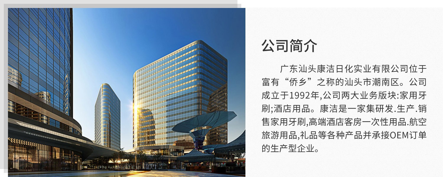 • 汕頭康潔日化實(shí)業(yè)有限公司是一家集研發(fā).生產(chǎn).銷(xiāo)售高端酒店客房一次性用品等各種產(chǎn)品并承接OEM訂單的生產(chǎn)型企業(yè)。
